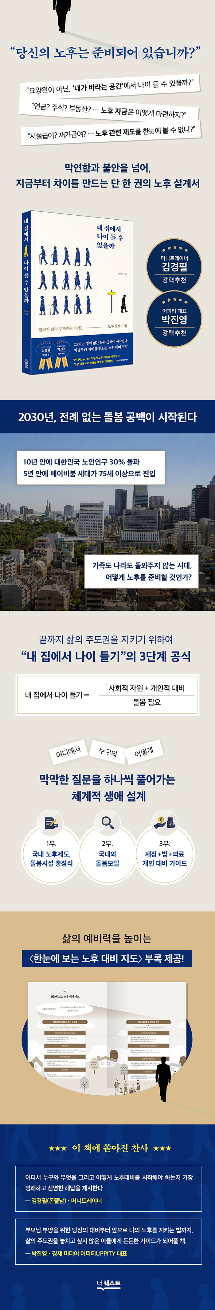 언제부터, 어디에서, 누구에게 돌봄을 받을 것인가? 노쇠를 감당할 나의 예비력은 얼마나 되며, 노후 대비의 부담을 나와 사회가 어떻게 분담할 것인가? 지금까지 살펴봤듯‘내 집에서 나이 들기’ 위해선 이런 질문들에 나만의 답을 찾아야 합니다. _ 4장. 우리는 왜 ‘나이 듦’을 두려워하게 되었나?