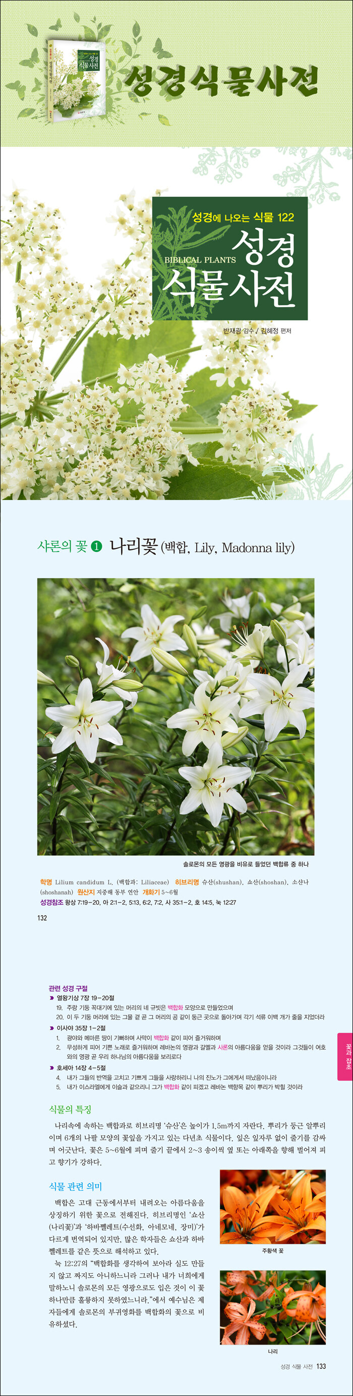 이 책은 성경에 나오는 식물 100여 종을 현재의 시각에서 범주별로 분류하여 간편하고 쉽게 이해할수 있도록 도감 형식으로 간략하게 설명하였다. 수천 년의 세월이 흐르면서 그 당시 식물들의 기후와 수질, 토양의 변화로 모양이나 형태가 변형되긴 했지만 식물의 속성은 그대로 유지되어 현재까지 대부분 지구상에 자생하고 있다. 성경에서 많은 식물들은 그 시대 사람들의 생활 가운데 식용뿐만 아니라 삶에 있어서도 지혜를 얻는 유익한 자연 공동체였음을 알 수 있다. 그동안 보편화되어 통상적으로 불리고 있는 식물들의 이름, 모양, 해당 구절들, 특징 그리고 의미를 살펴봄으로써 성경을 읽는 모든 분들에게 조금이나마 도움이 되고자 하였다.