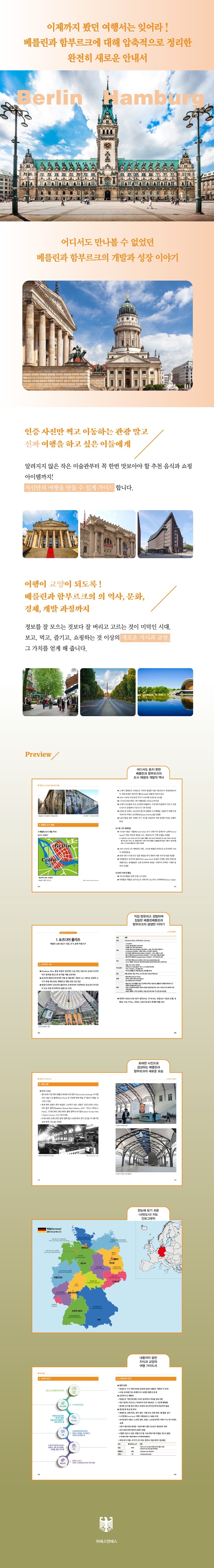 -베를린과 함부르크의 역사, 경제, 문화, 랜드마크, 주요 명소까지 한 권에 담다 베를린과 함부르크를 이해하기 위해 필요한 모든 것을 담았다. 베를린과 함부르크를 알기 전에 먼저 독일의 간략한 역사와 개황을 살펴보고 행정구역과 경제적, 문화적 특징을 알아본다. 그리고 베를린과 함부르크가 처음 태동한 이래 현재 모습을 갖기까지의 역사를 간략하고 알기 쉽게 정리한다. 그 뒤에는 문학과 예술, 음식과 패션 등 베를린과 함부르크가 만들어 온 문화를 소개하고, 베를린과 함부르크의 모습과 성격을 혁신적으로 변화시켜 온 주요 랜드마크와, 한번은 꼭 방문하기를 추천하는 명소를 조목조목 친절하게 짚어 준다.