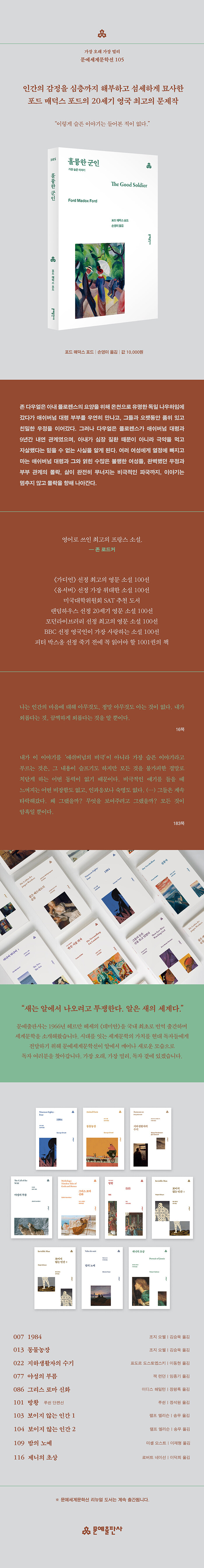 역사를 기록하는 소설가, 인간의 모순을 담다 섬세하고 회화적인 문체로 그린 20세기의 비극 포드의 문학에는 언제나 개인적 혼란과 시대적 불안이 교차한다. 포드는 소설가의 사명이 역사를 기록하는 것이라 여겼기에, 작품의 배경이 되는 시대의 인물상을 충실히 담아내고자 했다. 그는 20세기의 전쟁과 사회적 붕괴를 직접 목격하며 작가로서의 시선을 형성했고, 제1차 세계대전에 참전하며 전쟁의 참혹함과 인간성의 붕괴를 직접 목격하기도 했다. 포드의 삶은 복잡한 연애 관계, 정신적 쇠약, 전쟁의 트라우마로 그의 작품 속 인물들처럼 불안정했다. 《훌륭한 군인》은 인간이 스스로를 속이면서도 진실을 갈망하는 모순된 존재임을 보여주는 자전적 고백과도 같다. 여기에 포드는 그 특유의 섬세하고 아름다운 회화적 문체로 사랑하고 파멸하는 인물들의 모습을 극적이고도 아름답게 그려낸다. 그 덕분에 독자는 한순간의 치정극이 아닌, 문학, 미술, 역사가 어우러진 격조 높은 비극을 감상하는 듯한 느낌을 받을 수 있다. 《훌륭한 군인》이 BBC와 《가디언》을 비롯해 영국의 각종 매체에서 필독서로 꼽히는 이유도 거기에 있다. 독자는 이 소설에서 단편적인 로맨스가 아닌, 20세기 초 영국이라는 한 시대와 그 속에서 살아가는 인물들의 삶 자체를 만나볼 수 있을 것이다.