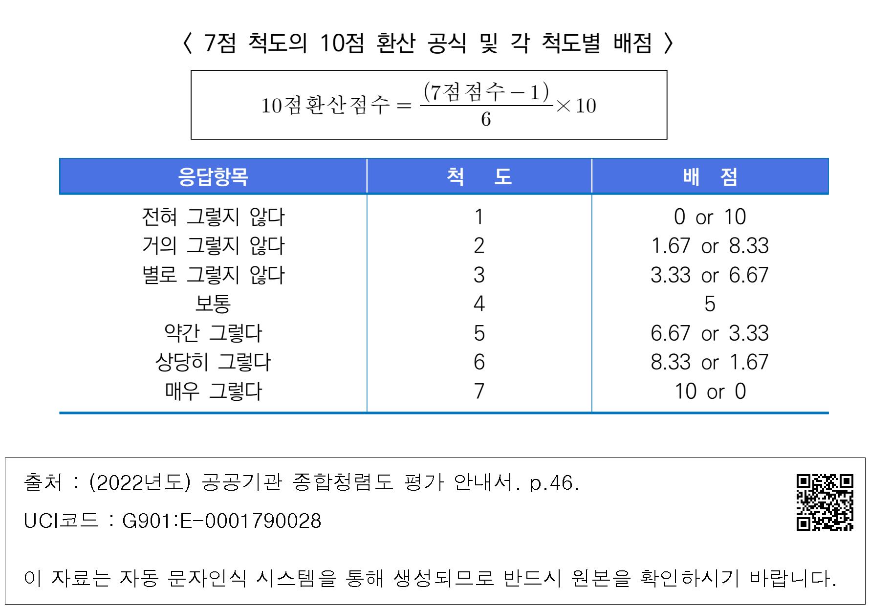 < 7점 척도의 10점 환산 공식 및 각 척도별 배점 >