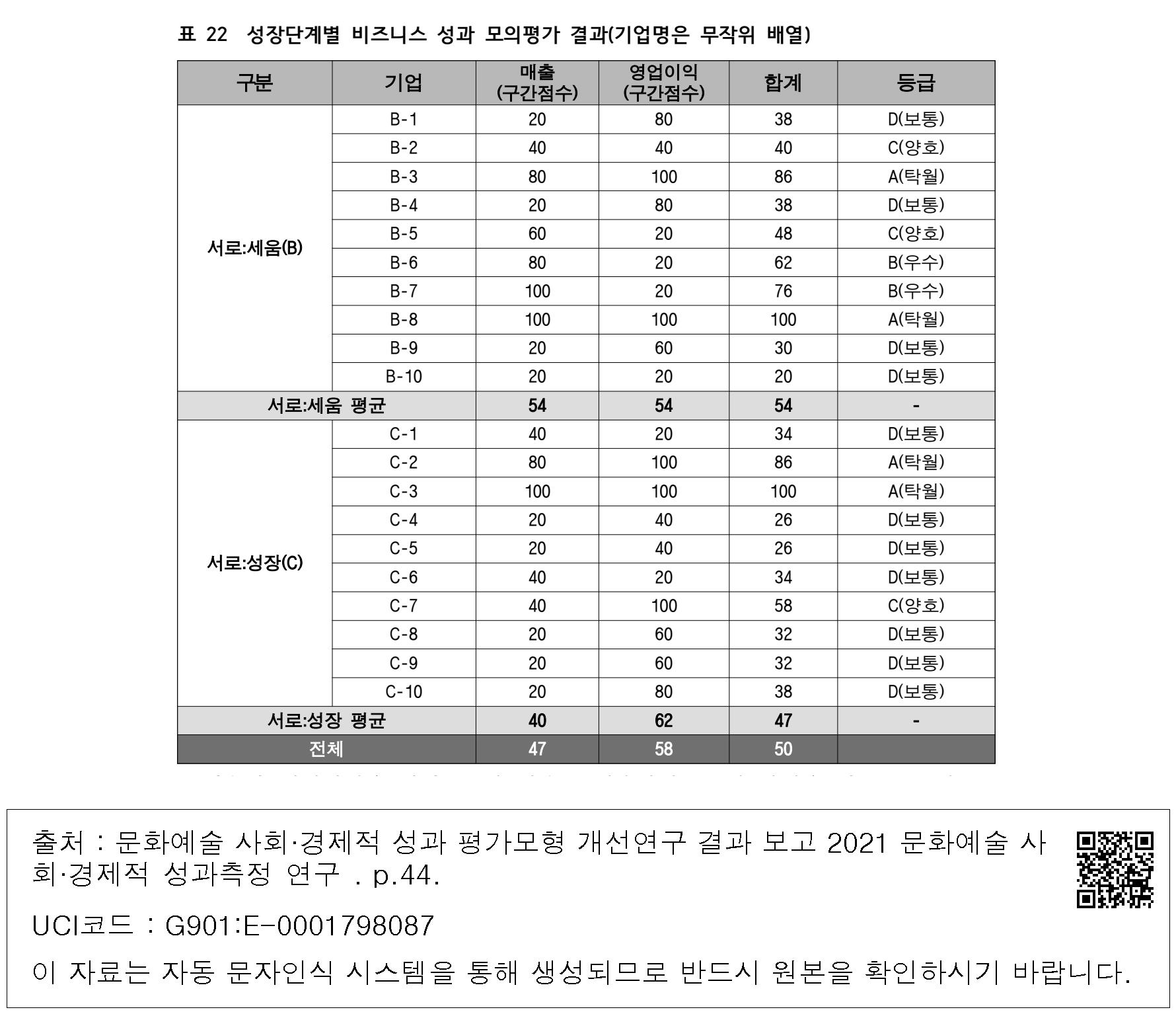 표 22 성장단계별 비즈니스 성과 모의평가 결과(기업명은 무작위 배열)