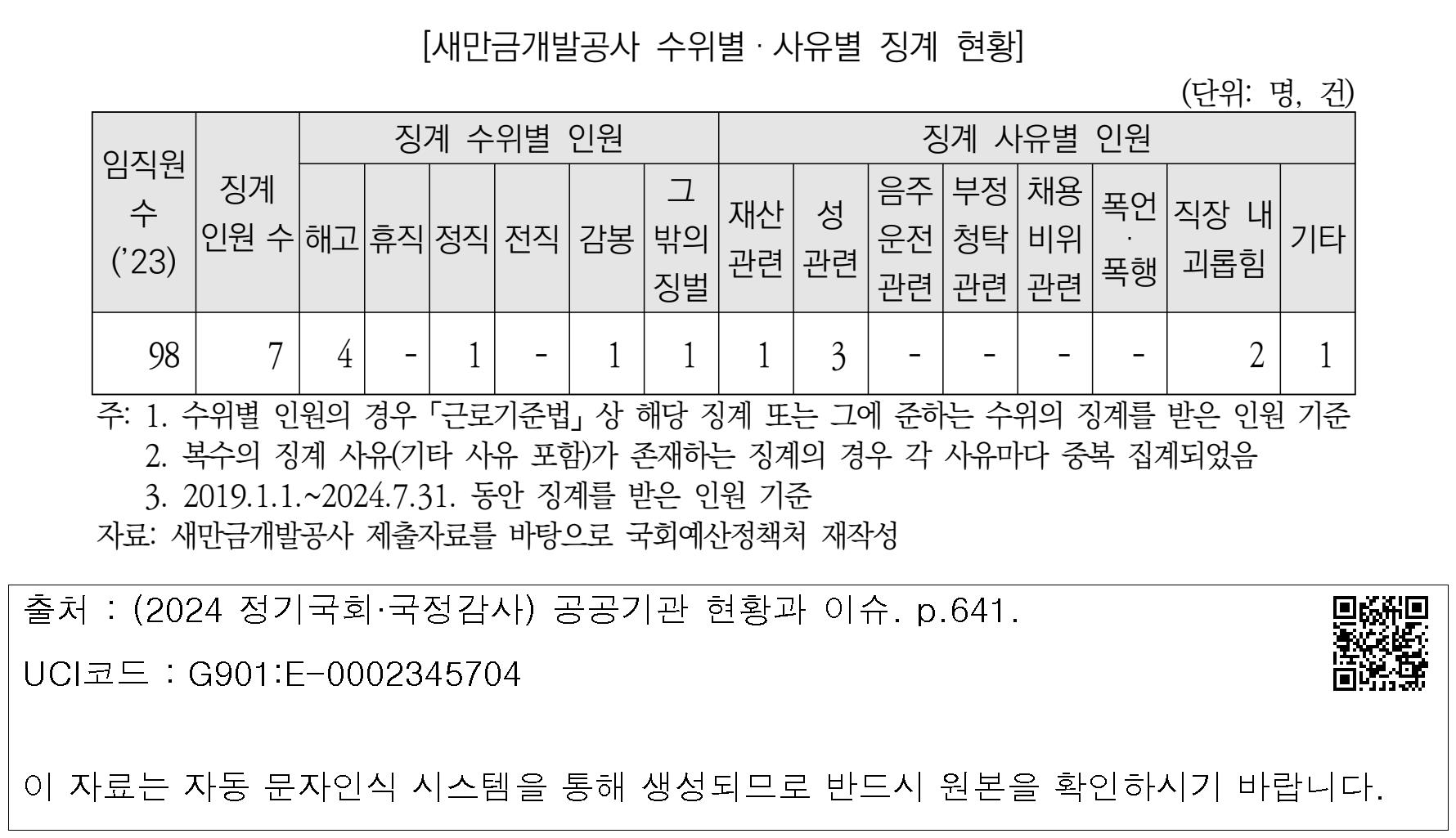 [새만금개발공사 수위별·사유별 징계 현황]