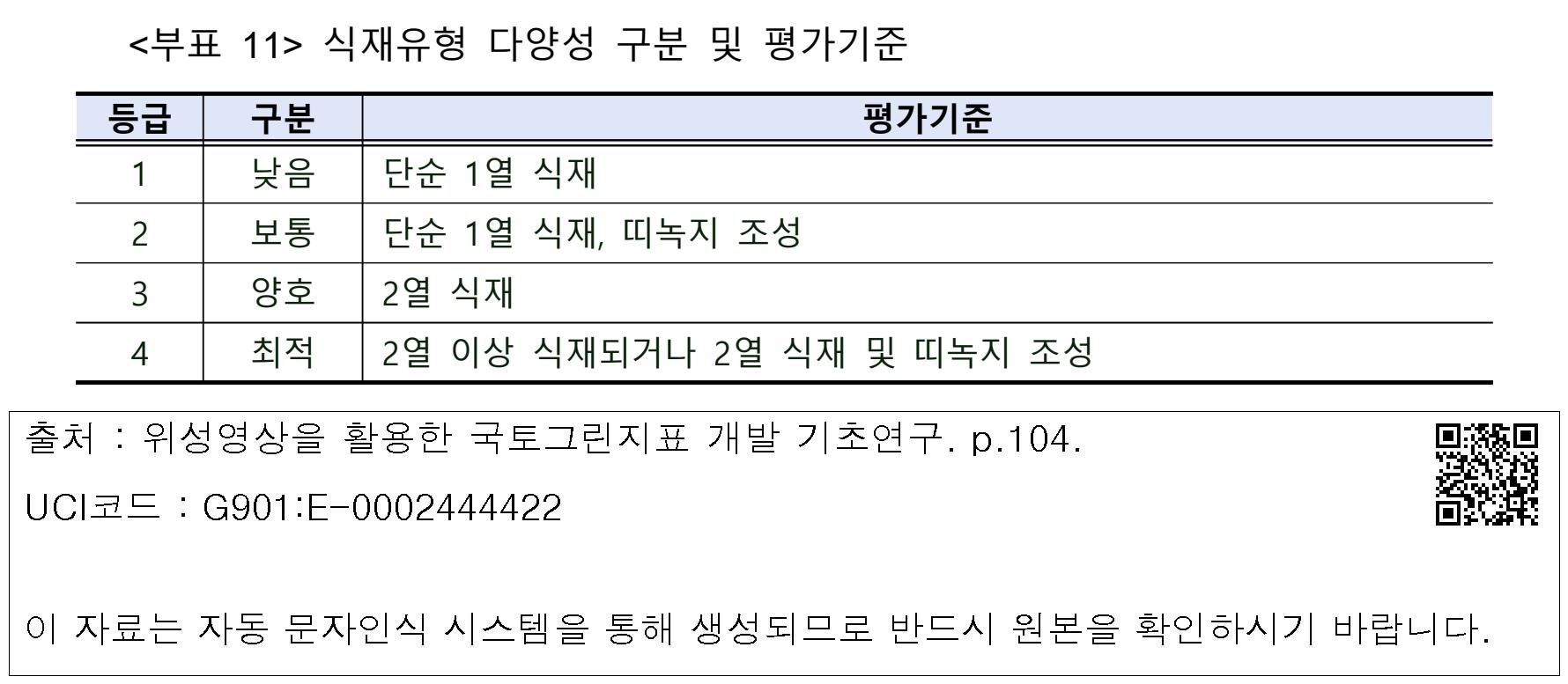 <부표 11> 식재유형 다양성 구분 및 평가기준