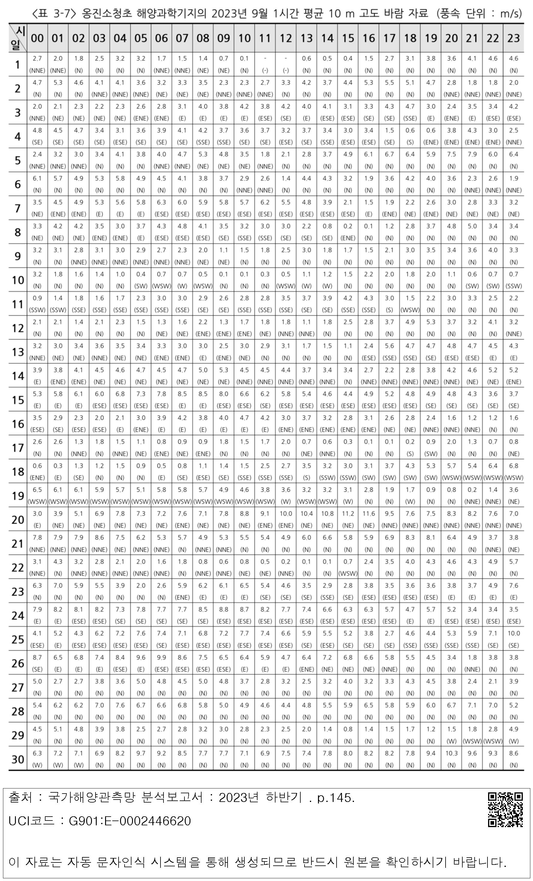 <표 3-7> 옹진소청초 해양과학기지의 2023년 9월 1시간 평균 10 m 고도 바람 자료