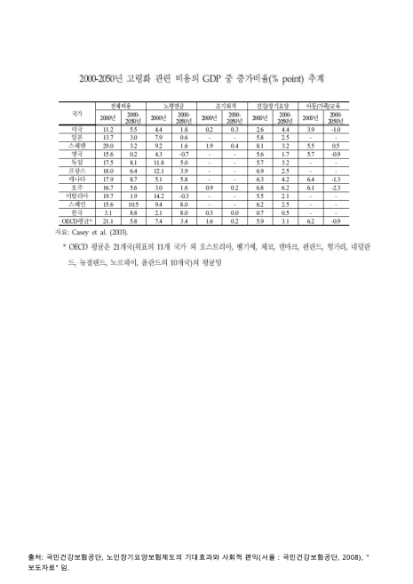 고령화 관련 비용의 GDP 중 증가비율 추계. 2000-2050 숫자표