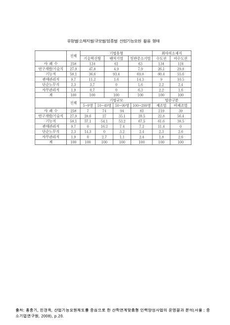 유형별/소재지별/규모별/업종별 산업기능요원 활용 행태. 2008 숫자표