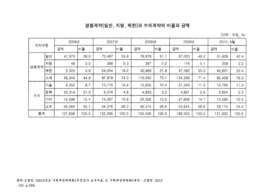 경쟁계약(일반, 지명, 제한)과 수의계약의 비율과 금액. 2006-2010. 8. 2006-2010 숫자표